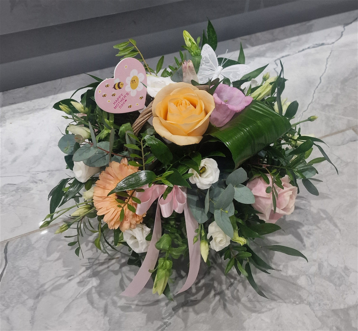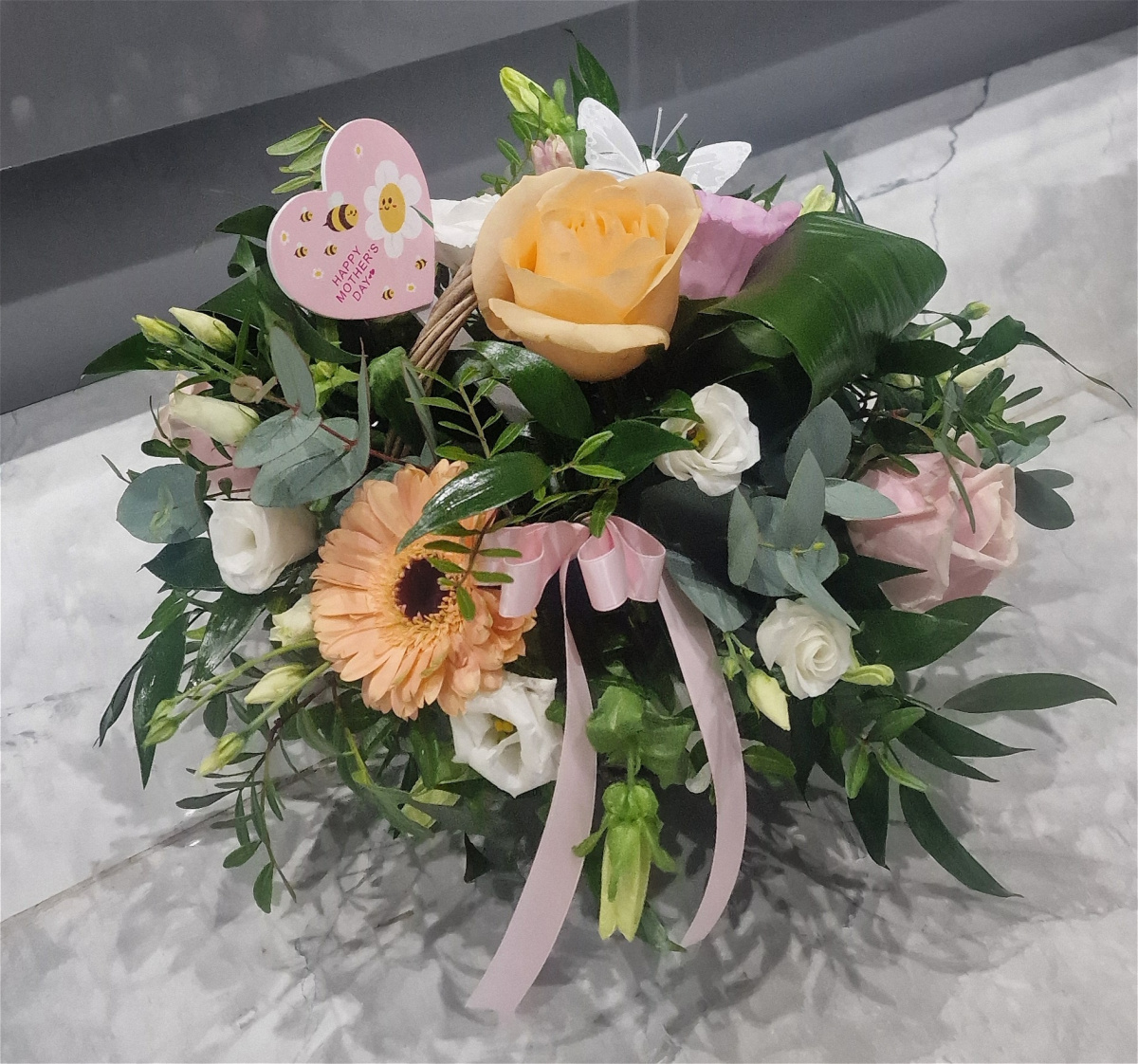 The Florist will choose the freshest Pastel Flowers in Pink, Peach and White from our wholesalers to create a soft pastel basket arrangement.