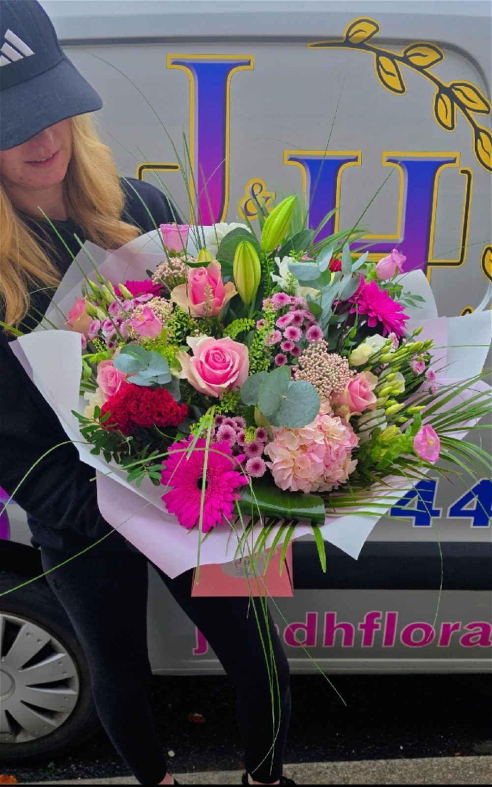 Red & Pink Flowers accompanied alongside beautiful fresh Eucalyptus and other mixed foliage's. Includes your favourites Pink Hydrangea, Red Roses, Pink Lilies